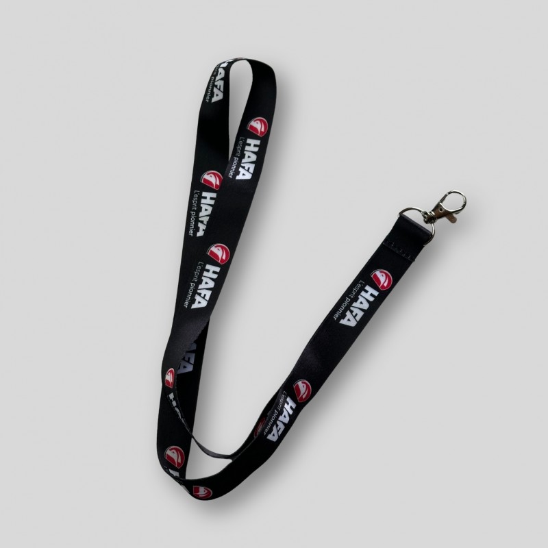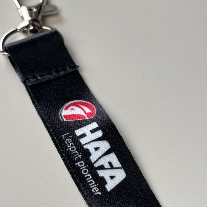 Lanyard fabriqué en polyester fin conforme à la réglementation de sécurité en vigueur.